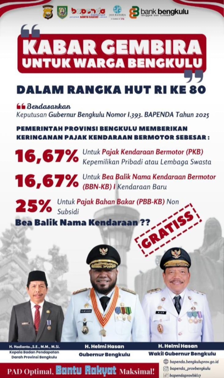 Berdasarkan surat keputusan Gubernur Bengkulu Nomor I.393.BAPENDA Tahun 2025 tentang pemberian keringanan dan/atau pengurangan pokok Pajak Kendaraan Bermotor, opsen Pajak Kendaraan Bermotor, Bea Balik Nama Kendaraan Bermotor, dan Pajak Bahan Bakar Kendaraan Bermotor, keringanan pajak yang dimaksud meliputi pengurangan 16,67 persen untuk PKB kepemilikan pribadi atau lembaga swasta, 16,67 persen untuk BBN-KB, dan 25 persen untuk PBB-KB non subsidi.