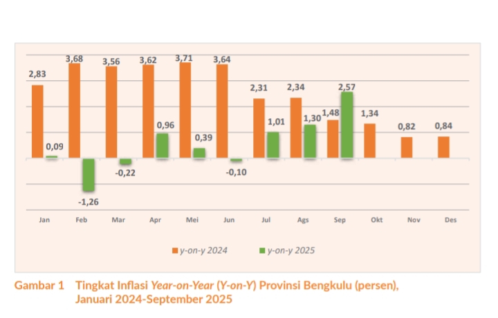 Radarkoran.com - Badan Pusat Statistik (BPS) Provinsi Bengkulu melaporkan bahwa inflasi year-on-year (y-on-y) Provinsi Bengkulu pada bulan September 2025 mencapai angka 2,57 persen. Angka ini meningkat dibandingkan dengan bulan sebelumnya yang berada pada angka 1,30 persen.
