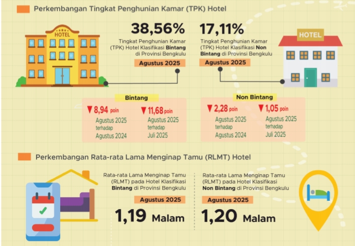 "Sedangkan rata-rata lama menginap hotel klasifikasi non bintang pada Agustus 2025 selama 1,20 malam, naik 0,03 poin jika dibandingkan Agustus 2024 dan naik 0,05 poin jika dibandingkan Juli 2025," jelas Kepala BPS Provinsi Bengkulu, Ir. Win Riza, ME baru-baru ini.
