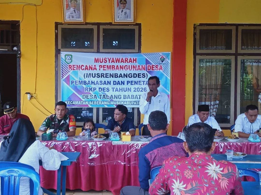 Radarkoran.com-Pemerintah Desa Talang Babatan, Kecamatan Seberang Musi Kabpaten Kepahiang menyelenggarakan Musyawarah Perencanaan Pembangunan Desa (Musrenbangdes) dan sekaligus penetepan Rancangan RKPDes Tahun Anggaran (TA) 2026. Kegiatan berlangsung di Balai desa, dengan menghadirkan berbagai unsur masyarakat sesuai daftar undangan yang telah ditetapkan.