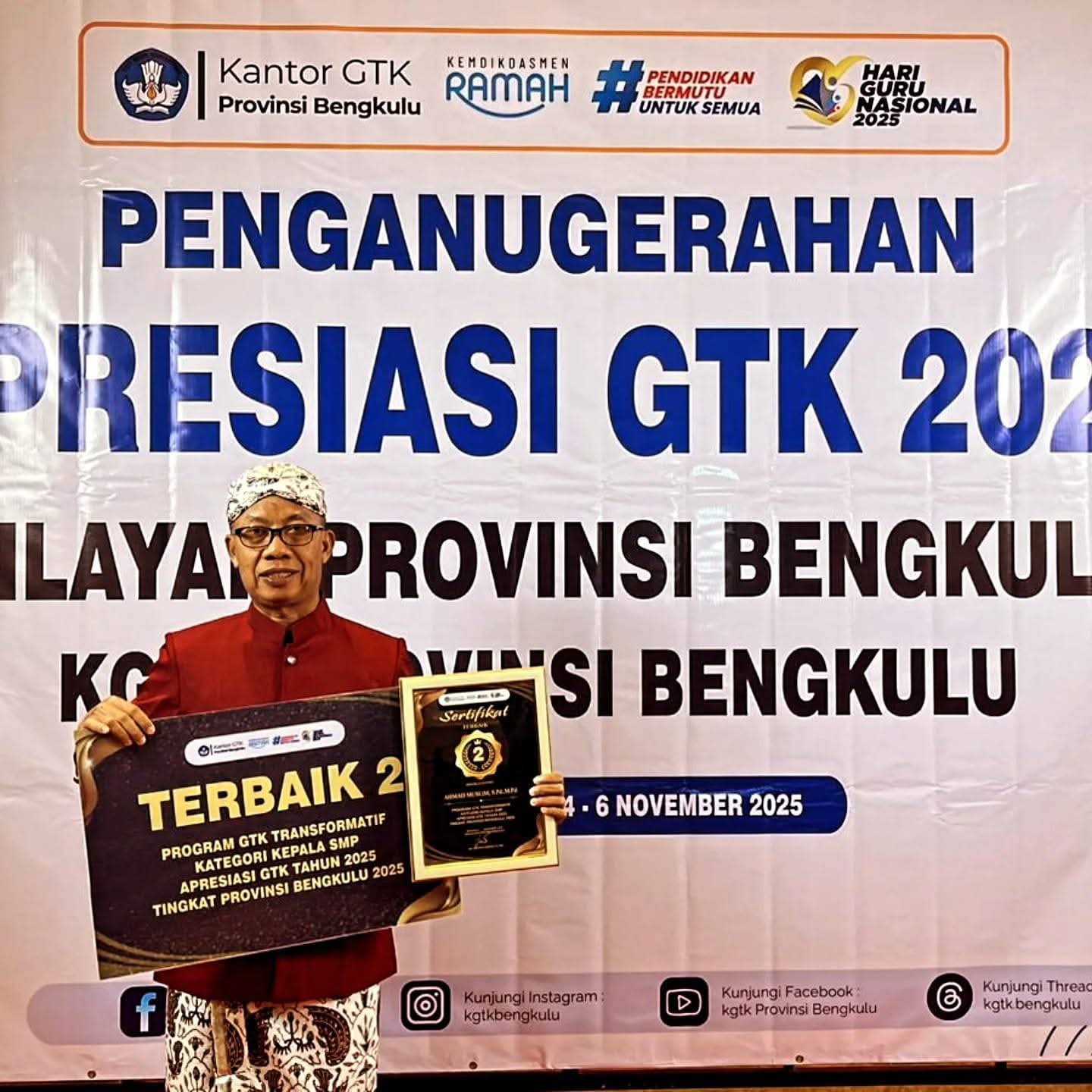 Radarkoran.com-Kepala Sekolah SMPN 2 Kepahiang, Kabupaten Kepahiang Provinsi Bengkulu Ahmad Muslim, M.Pd, Mat,berhasil meraih 2 penghargaan bergengsi sekaligus. Yakni dalam ajang Apresiasi GTK dan KGTK Dengan Kategori AGP ( Anugrah Guru Prima ) juara 2 dan juara 2 Kategori Kepala Sekolah KGTK 2025 tingkat SMP yang diselenggarakan di tingkat provinsi.