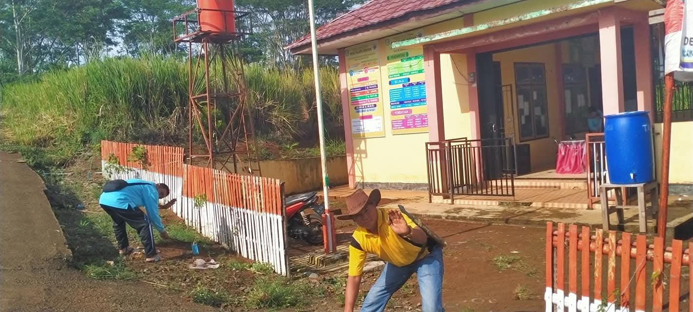 "Kita disini membersihkan sampah, merapikan rumput liar, dan memangkas ranting yang mengganggu.Selain itu juga kita merapikan meja, kursi, dan area kerja lainnya di dalam kantor," kata Kades Ali Imron.