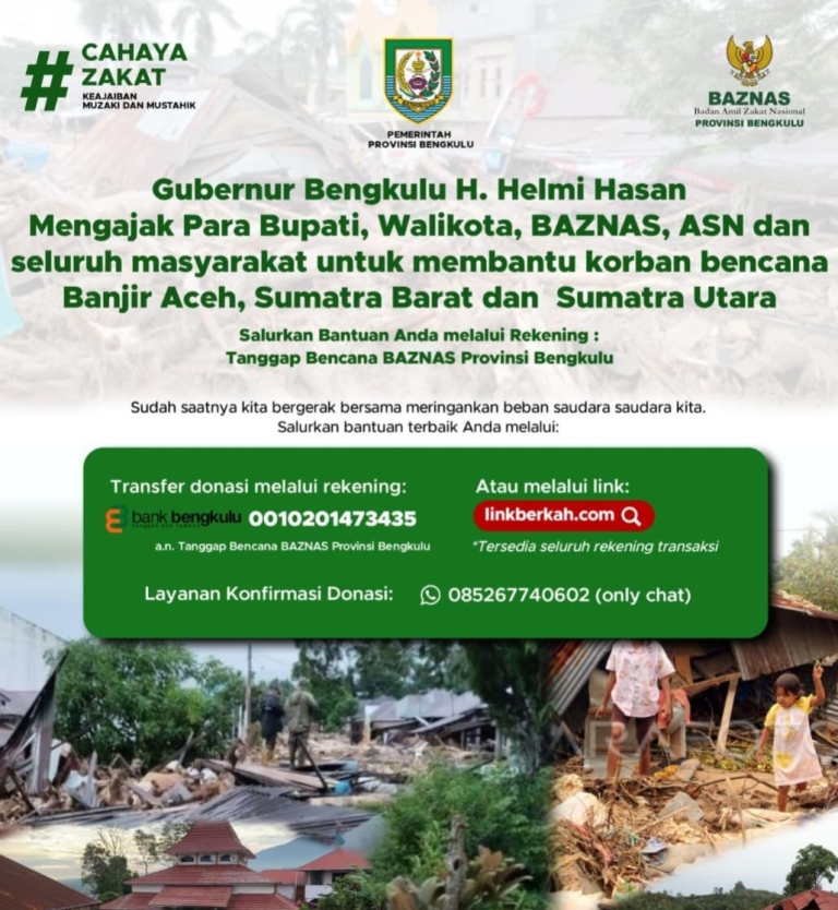 Sebagai informasi, bagi masyarakat Bengkulu yang ingin berdonasi dapat menyalurkan bantuan melalui Rekening Tanggap Bencana BAZNAS Bengkulu di Bank Bengkulu dengan nomor 0010201473435, atau melalui aplikasi https://Linkberkah.com. Layanan BAZNAS juga dapat diakses melalui WhatsApp 0851 4234 3932 maupun situs resmi https:/www.bengkulu.baznas.go.id.